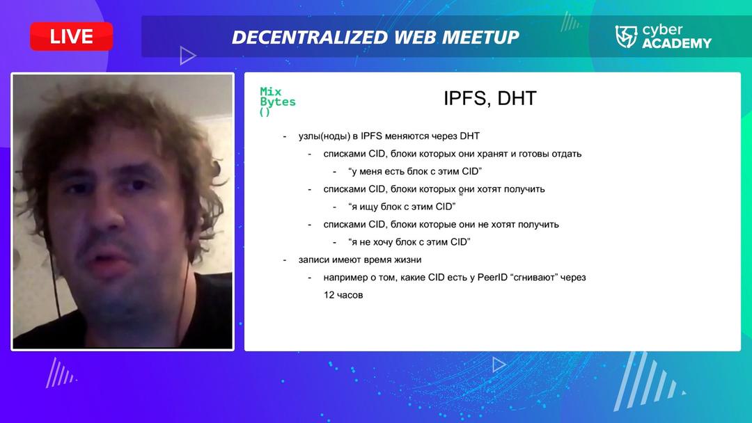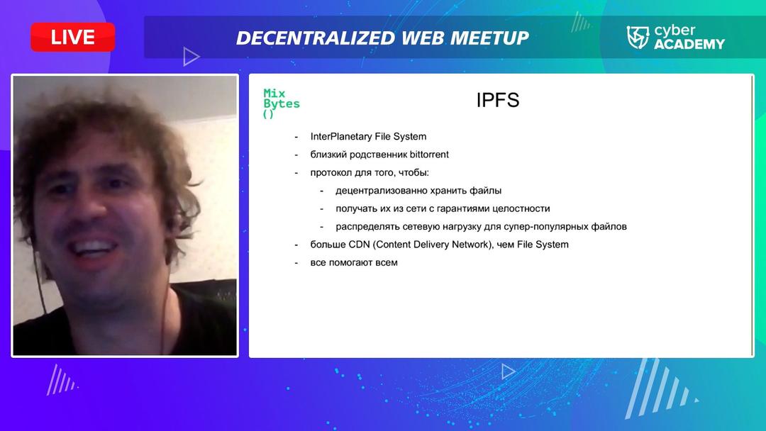 🌐 IPFS (InterPlanetary File System) – ключевая технология для децентрализованного веба. На Decentralized Web Meetup #4 мы подробно разбираем IPFS с Сергеем Прилуцким (MixBytes), а также обсуждаем его практическое применение с Кириллом Лаптановичем (DevOps cyb.ai) и Константином Лысенко (Tech Lead R&D Group, 482.solutions).
