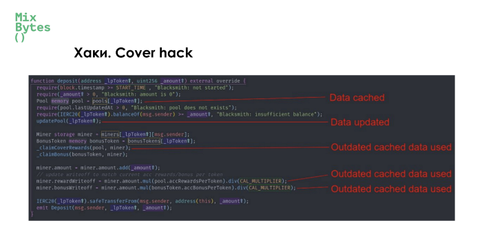 Одним из самых интересных и несложных хаков последнего времени была атака на протокол для страхования Cover. Разработчики иногда сохраняют некоторые переменные в кэш и при необходимости вызывают их оттуда. Это делается для экономии памяти. В случае с Cover, так хранились данные о LP-пуле, которые обновились, но в функциях продолжила использоваться устаревшая закэшированная информация. Это позволило хакеру выписать себе вознаграждение в несколько квинтиллионов токенов COVER, которые он потом сливал в пул, выкачивая из него ETH.