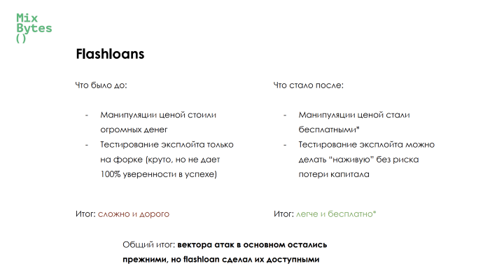 Стоимость атаки на DeFi-протоколы снизилась с десятков миллионов долларов до цены газа после появления flashloans , инструмента позволяющего одолжить практически любое количество выбранных токенов у какого-либо кредитного протокола без залога с условием возврата в той же транзакции.
